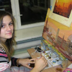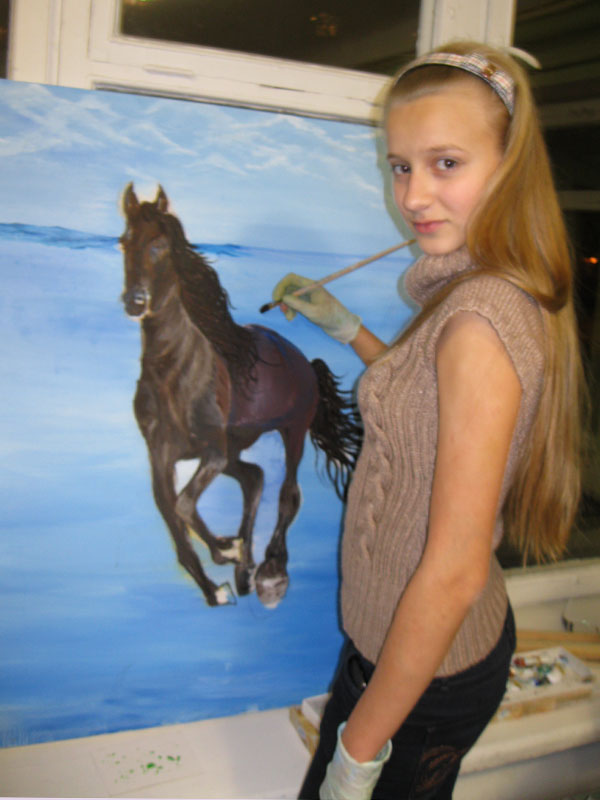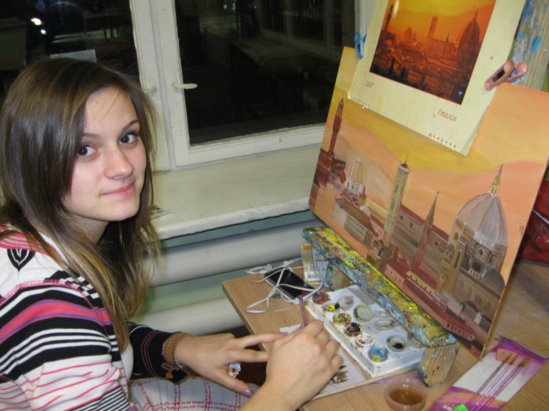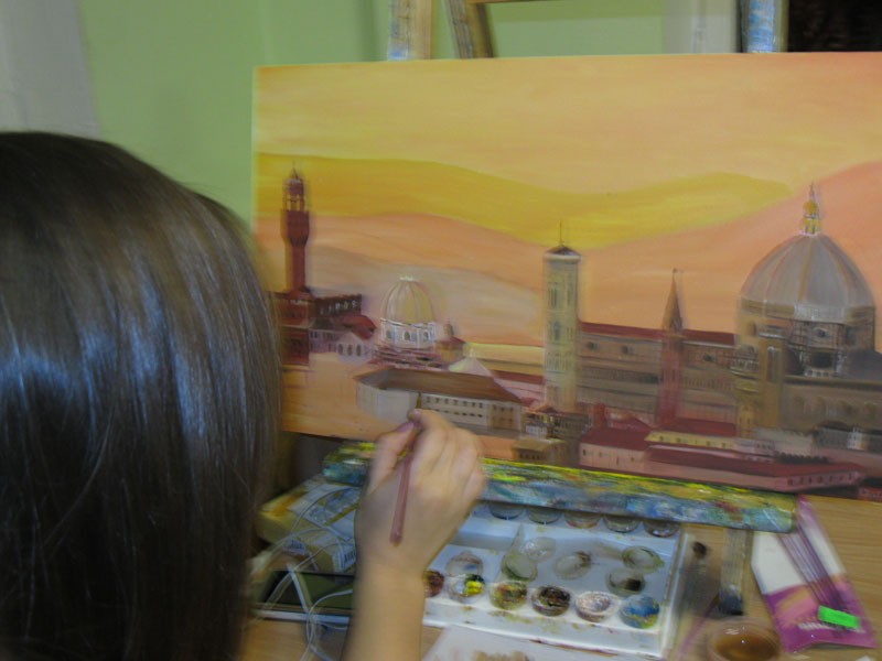 Девиз студии – «Можно ВСЕ!». Каждый сам выбирает, чем он хочет заниматься, что и как рисовать. Кто-то вспомнил урок труда, где мы учились делать мотанки, кто-то кропотливо заканчивает новую модель, иной увлекся батиком. Рисовать масляными красками – это обязательное умение для всех студийцев старшей школы. Но далеко не все рискнут писать картину 90 на 70 см в свою гостиную. На это нужна смелость… ну и конечно, опыт работы.