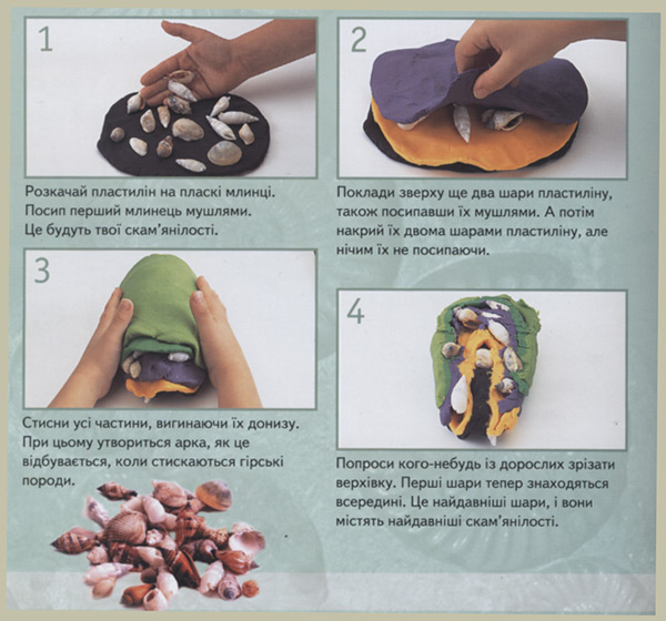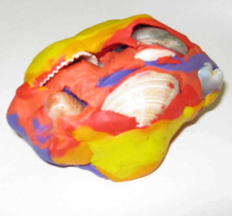 1. Раскатай пластилин на плоские блинчики. Посыпь ракушки на первый слой. Это будут окаменелости.