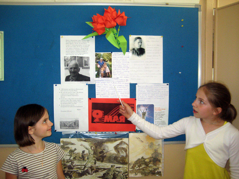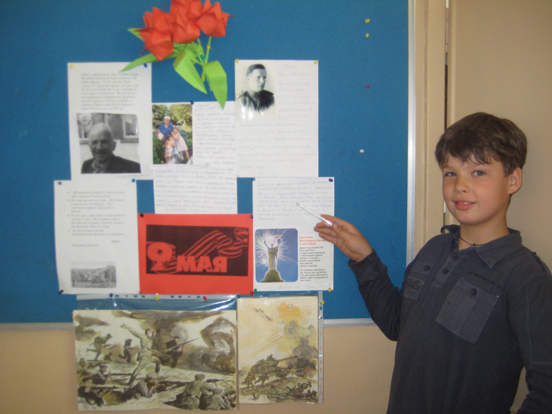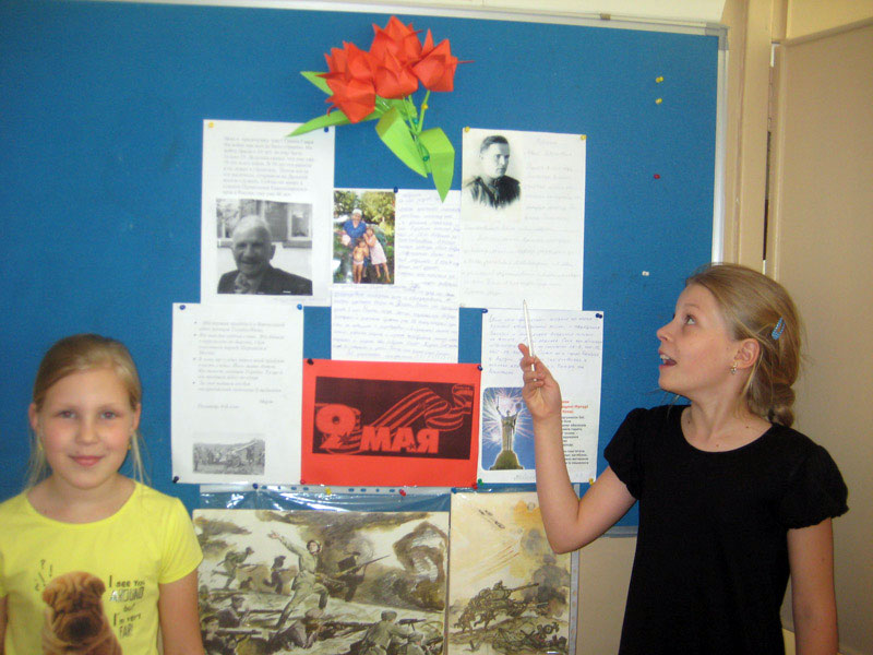 К этому памятному дню, дню Победы, дети младшей школы подготовили презентацию, посвящённую ветеранам Великой Отечественной войны. Они принесли фотографии своих родных и близких, рассказали об их участии в войне, о подвигах, которые они совершили.