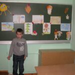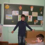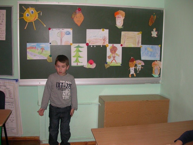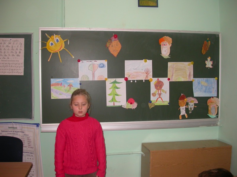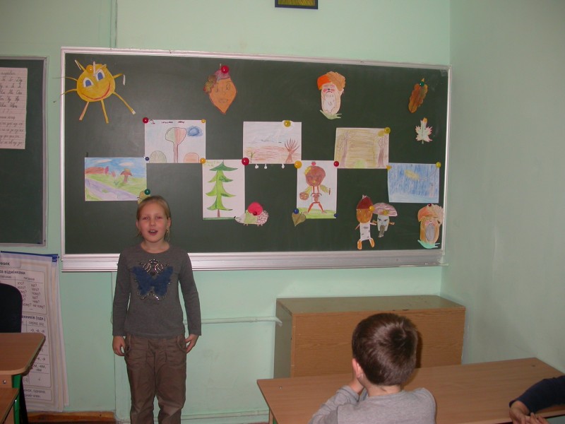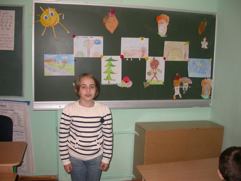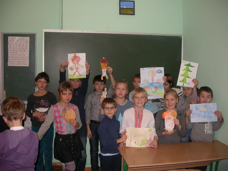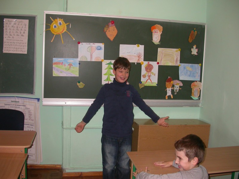 Веселого осіннього чоловічка зобразили Ілля та Данило Савченко. Осіннє сонечко виготовила Лєна Денищук. Весело поглядав з дошки «дядько-жолудь», намальований Дашою Сізовою. Чудові грибочки виготовили: Маша, Влада і Богдана. Їжачок наколов на голки осінні листки і яблука та поспішав до ялинки (автори малюнків Макар і Аня).