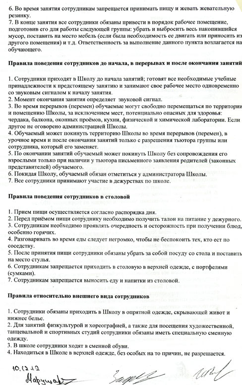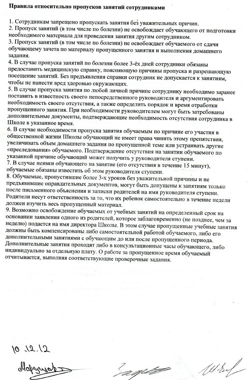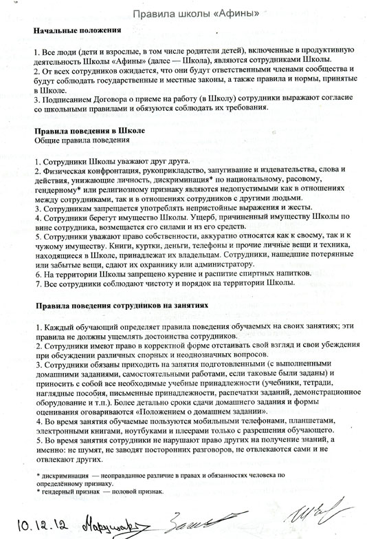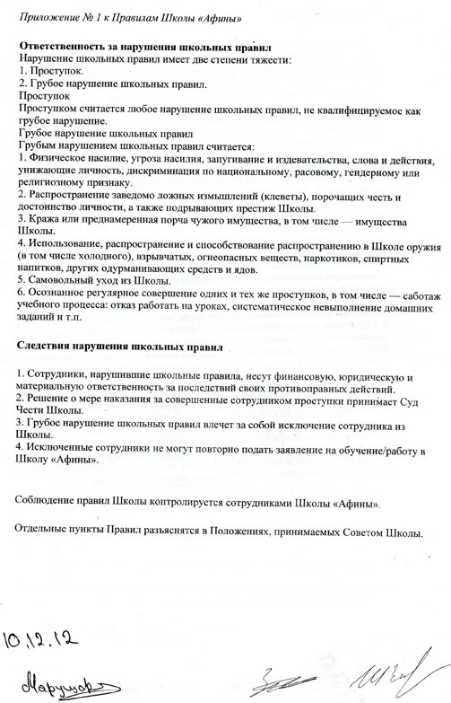 Правила школы “Афины”, заверенные Советом школы, от 10.12.12.