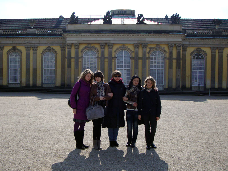 Двух-трехэтажные особняки, кафе, ресторанчики в старонемецком стиле, ратуши, Бранденбургские ворота (да, они есть не только в Берлине), русская деревня Александровка, Цецилиенхоф  и, конечно же, Сан-Суси – самый известный дворец Потсдама, летняя резиденция Фридриха Великого. Кстати, на могилу которого Ангела принесла не цветы, а картофель. Почему? Спросите у ребят, они теперь все знают!