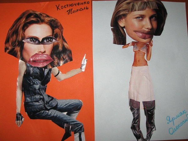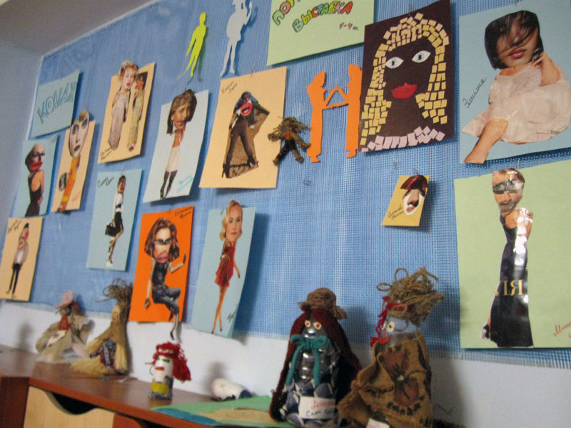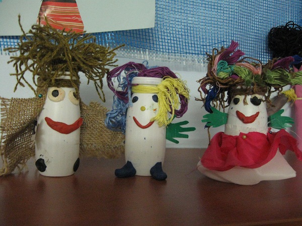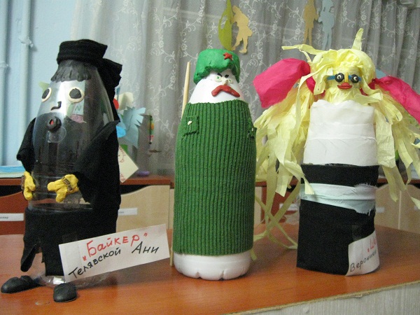 Все классы сделали своих человечков в разных стилях. Были представлены мультяшные герои в технике “предметной” аппликации, автопортреты “мозаичной” и “спичечной” аппликации, карикатурные коллажи, бумажные куколки-цилиндрики, “мотанки”, портреты из ткани, а также множество куколок из пластиковых бутылок…